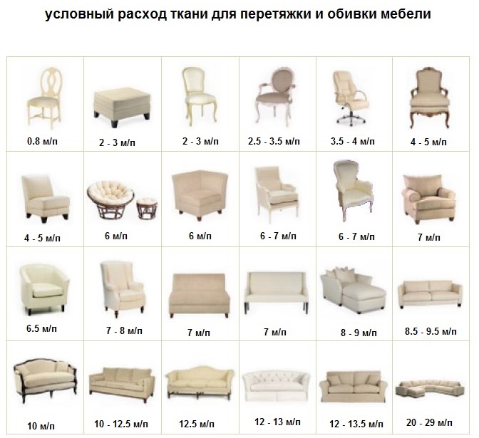 Для приблизительного подсчёта умножьте сумму длины и ширины предмета мебели на 2. Так, для дивана с размерами 1,6 × 2 м нужно будет больше 7 погонных метров ткани.