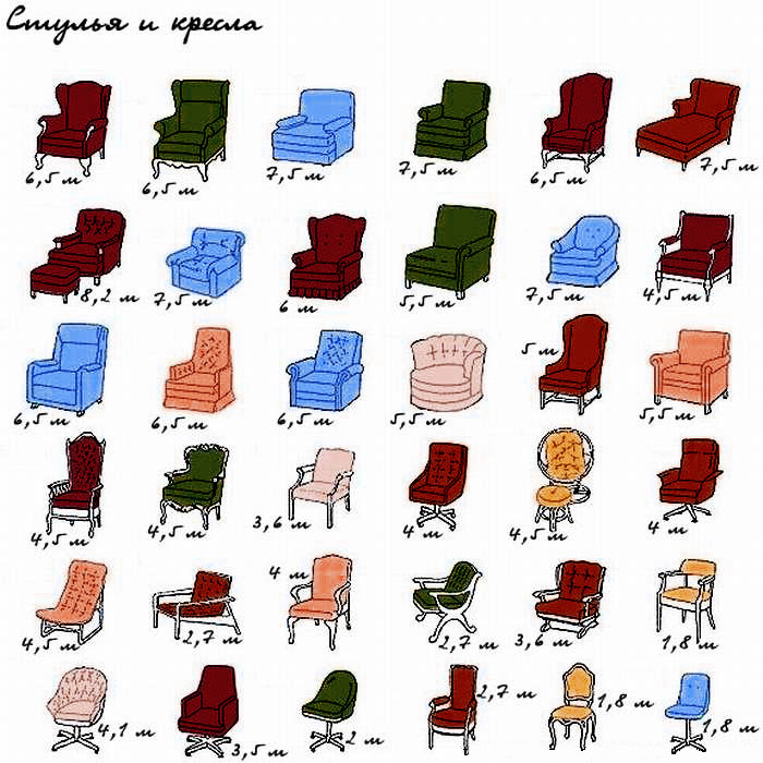 Так, на кресло вам понадобится от 2,7 м (на самое простое) до 7,5 м (на кресло-кровать) или 8,2 м (на кресло с пуфом). Для стульев необходимо 2–3 м ткани, для пуфов 2–5 м. На диван придётся приобрести от 2,7 м (компактный простой) до 31 м (двойной угловой).