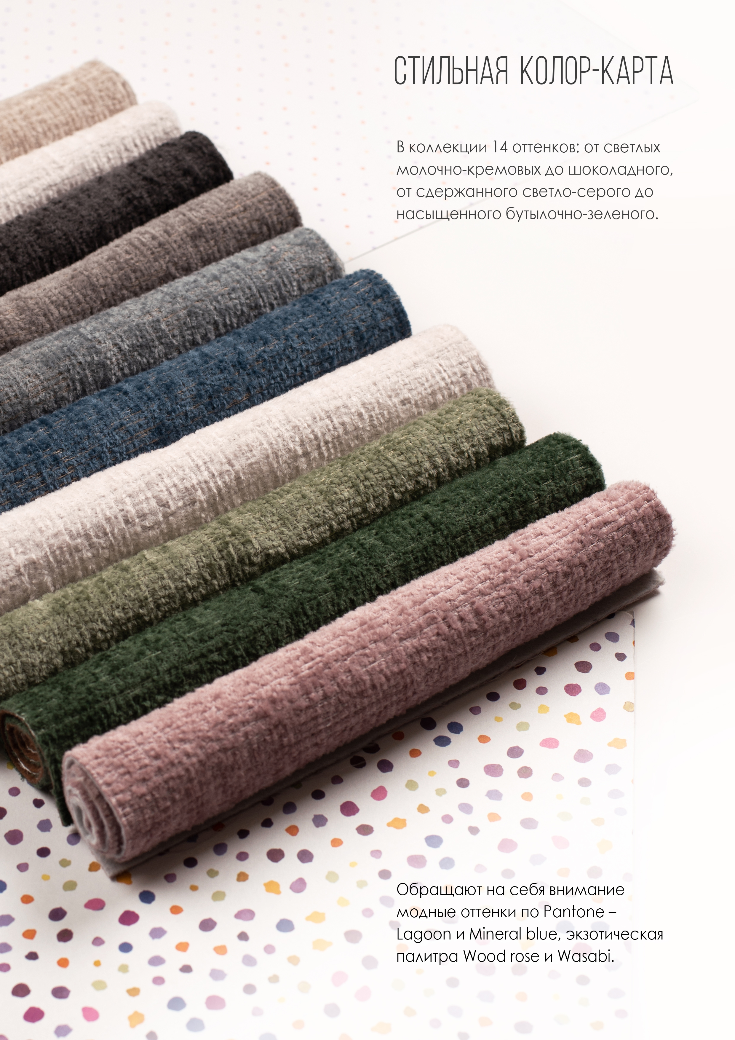 Комбинация базовых серо-бежевых тонов и запоминающиеся трендовые оттенки гармонично сливаются в модной колор-карте из 14 цветов. Уникальная фактура создается благодаря переплетению разных по структуре и цвету нитей – каждый сантиметр ткани получается неповторимым. Такой материал будет гармонично смотреться в мебели любого стиля, от винтажного до современного.